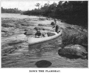 We had been on our way two days, and soon the increasing current, necessitating little paddling, and a distant roar announced that we were nearing the rapids, the Flambeau being full of them and most of them being negotiated only by Indians and in long river bateaux. Picking our way among the rocks, as carefully as the 20-mile current would permit us, we negotiated most of the falls without mishap. The one [upset] came in jumping a little four-foot fall called “Potatoe Falls,” near the town of Park Falls, when the bow of the canoe struck a submerged rock and we were unceremoniously dumped in the water. Everything being lashed, we lost nothing but a small camera, and within an hour, everything was dried in the sun, and the journey proceeded.