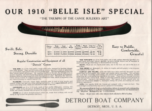 The article serves as a claim for the success of the “Belle Isle” canoe of 1910, created by the Detroit Boat Company. A 17-foot “Belle Isle” canoe, like the one used in the article before, would have cost $51 in 1910. To place that in context, based on a 1910 catalogue of the Capital Boat and Canoe Works, the price of similar style canoes ranged from $35 to $59. The following description of the “Belle Isle” canoe comes from an advertisement published by the Detroit Boat Company.